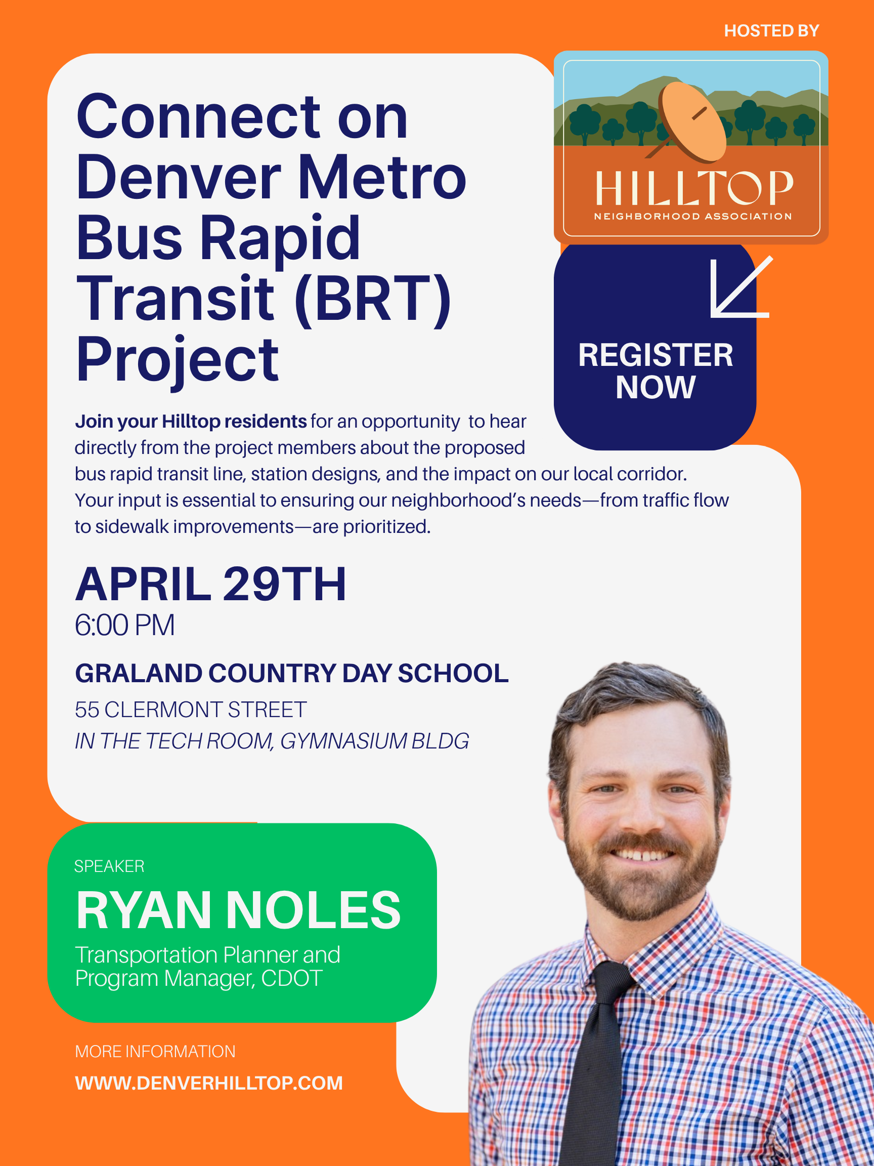 Join the Hilltop Neighborhood Association (HNA) for a community meeting with the Colorado Boulevard BRT Project team on April 29th at 6:00 PM at Graland Country Day School. As we approach critical 2026 milestones, this is your chance to hear directly from project members about proposed station designs, traffic flow, and sidewalk improvements along our local corridor. Whether you have specific questions regarding residential access or simply want to stay informed on the future of Colorado Boulevard, your input is vital to ensuring Hilltop’s needs are prioritized—we look forward to seeing you there!