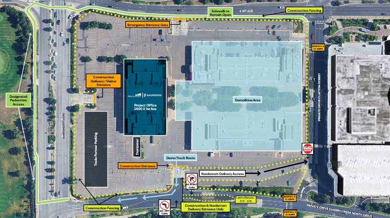To reduce neighborhood impacts, all workers are required to complete site-specific safety training and follow a Code of Conduct, and all construction parking for demolition will be contained within the fenced area rather than in nearby neighborhoods or the shopping center garage. Dust, noise, and erosion control measures will be in place, and work will comply with City and County of Denver hours: 7:00 a.m. to 7:00 p.m. on weekdays and 8:00 a.m. to 5:00 p.m. on weekends. Pedestrians will see clearly marked access points, sidewalk closures, and lane closures around the perimeter, particularly along East 1st Avenue, as shown in the project’s fence and logistics plan.