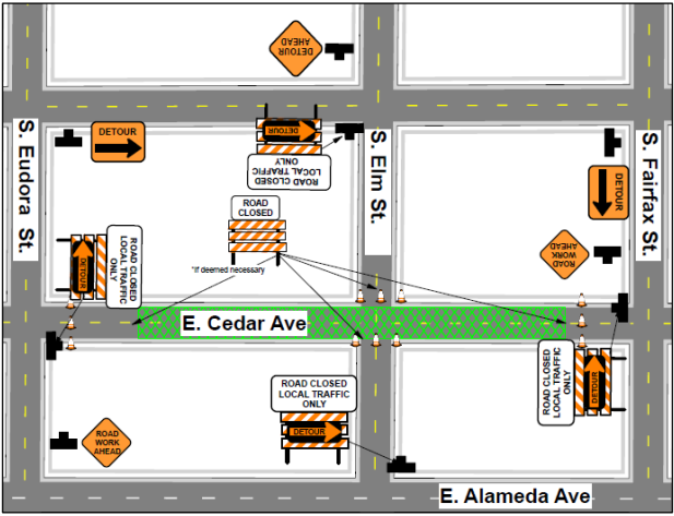 The intersection of E. Cedar Ave/S. Elm St. will be closed; intersections at E. Cedar/S. Fairfax and E. Cedar/S. Eudora will remain open Neighbors should expect full street closures and look for alternate routes in the area.
